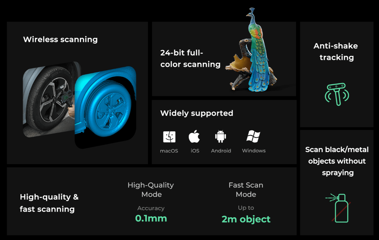 Yüksek Hassasiyet: Yaklaşık ±0.1 mm doğrulukla detaylı 3D tarama yapar.