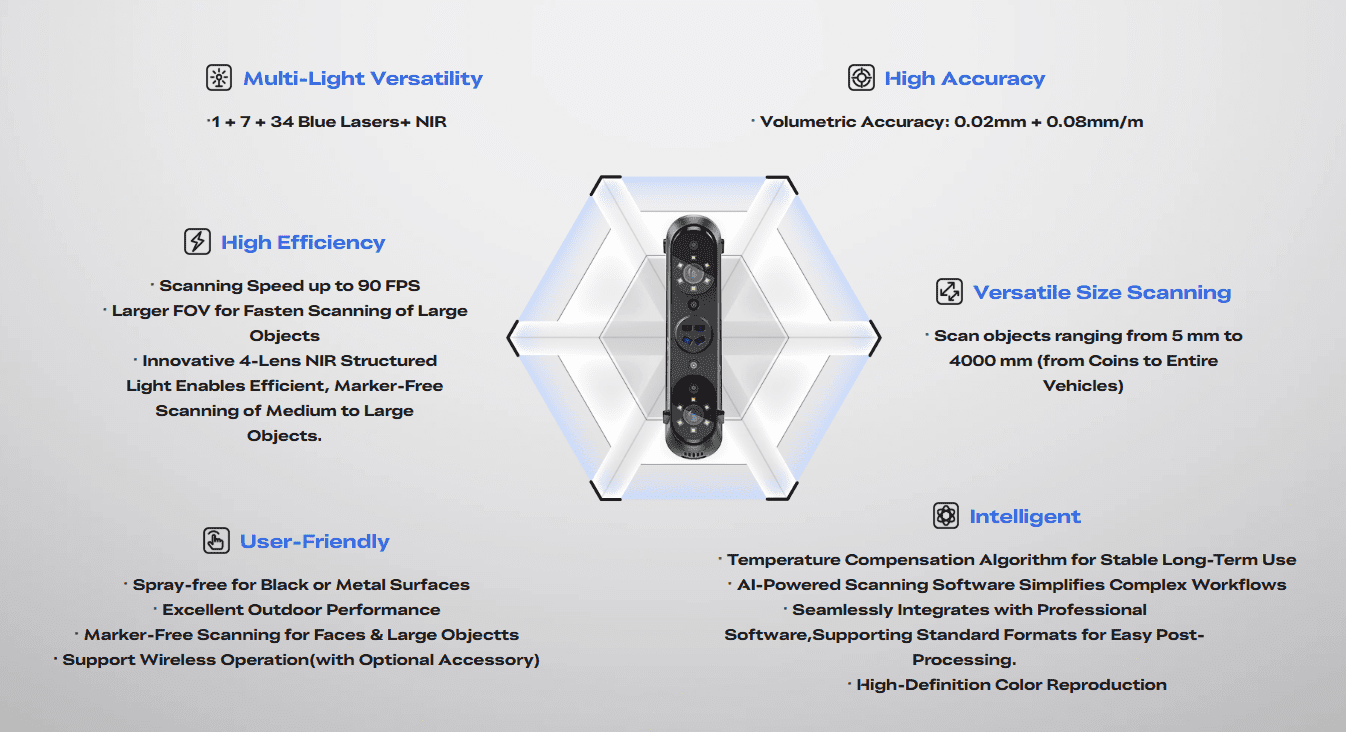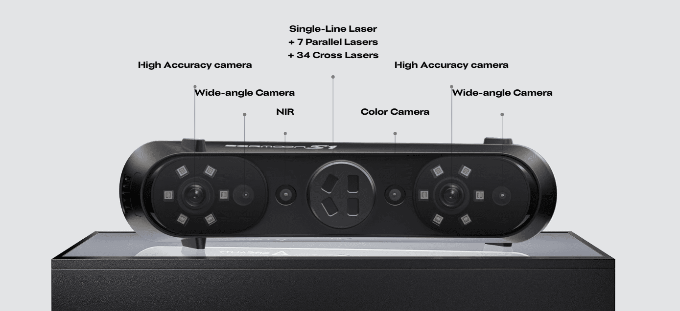 Creality Sermoon S1, çok ışıklı lazer + NIR tarama, çok geniş tarama aralığı (5 mm–4000 mm), yüksek hassasiyet (~0,02 mm) ve hızlı tarama performansı ile hem profesyonel hem hobi/üretim amaçlı kullanım için güçlü bir el tipi 3D tarayıcıdır.