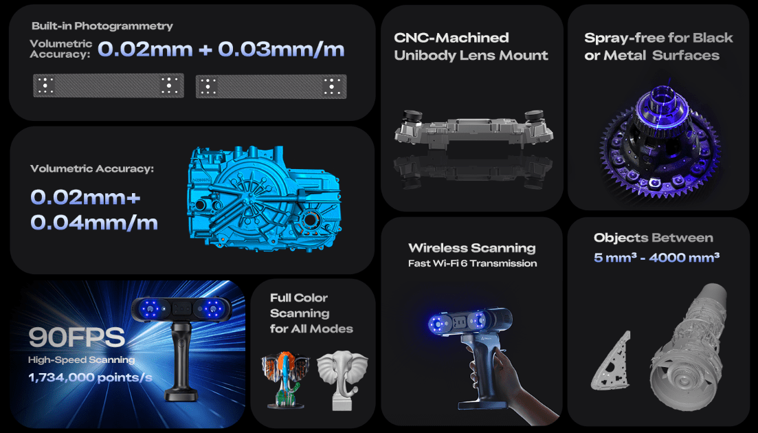 Geniş tarama aralığı: 5 mm³–4000 mm³ boyut aralığında nesneleri tek cihazla tarayabilir.